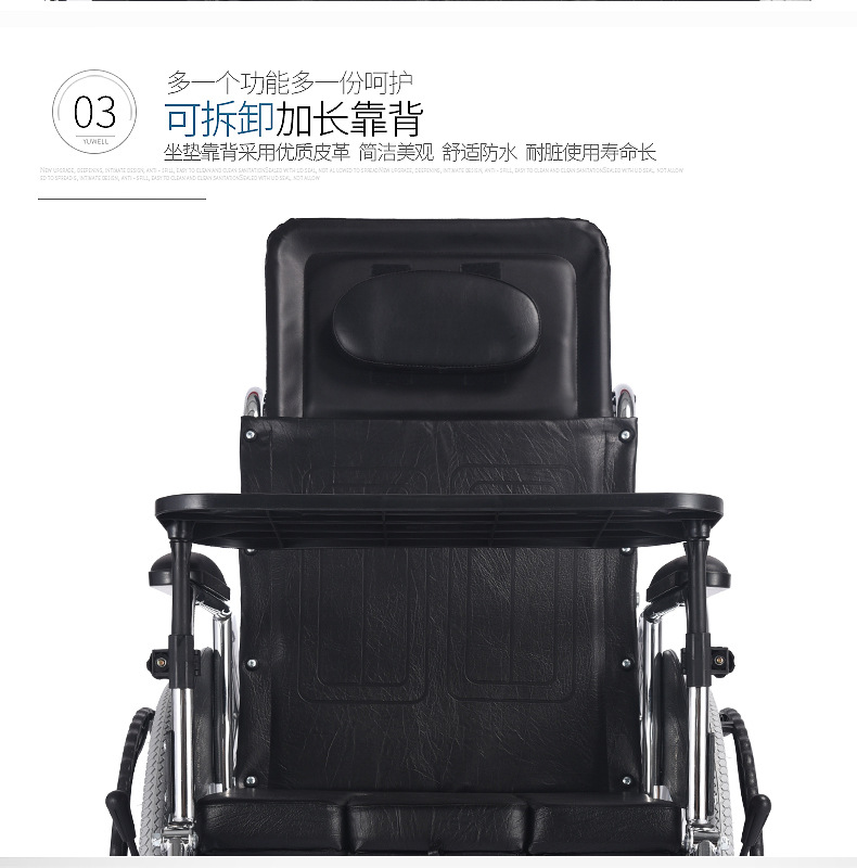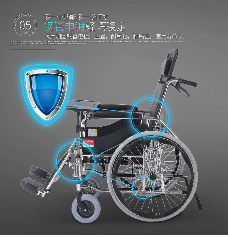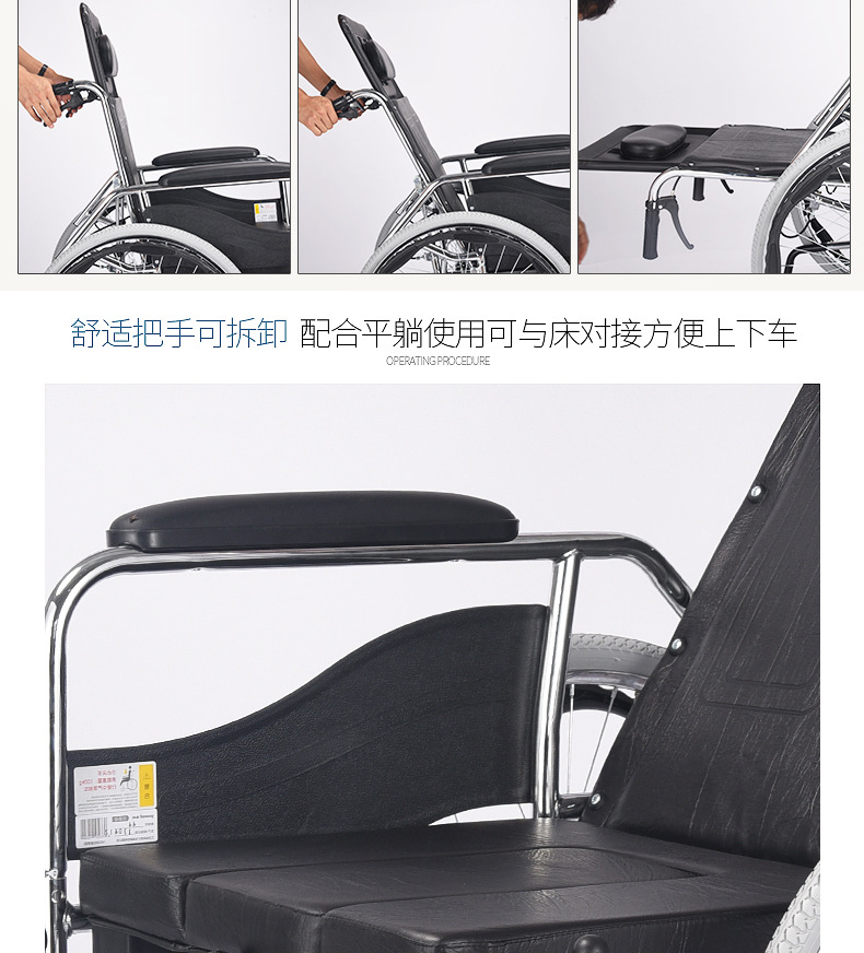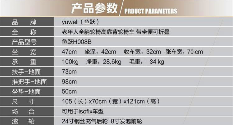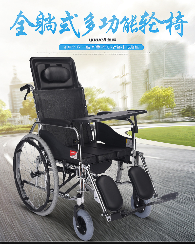 鱼跃轮椅车H008B 折叠带坐便全躺老年残疾人代步轻便扶手可拆轮椅