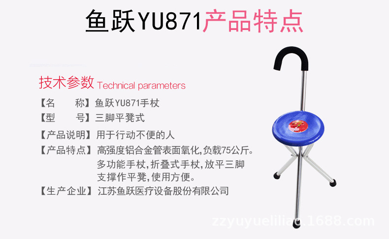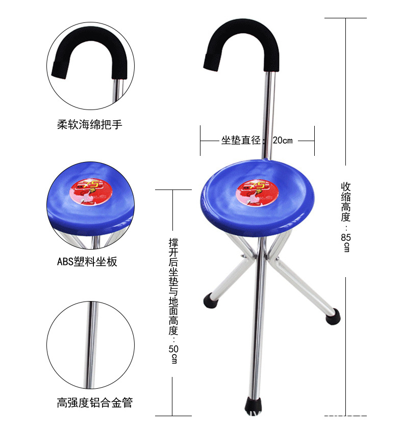 鱼跃三脚拐杖YU871 铝合金多功能凳拐可坐隔滑三脚手杖老人拐杖凳